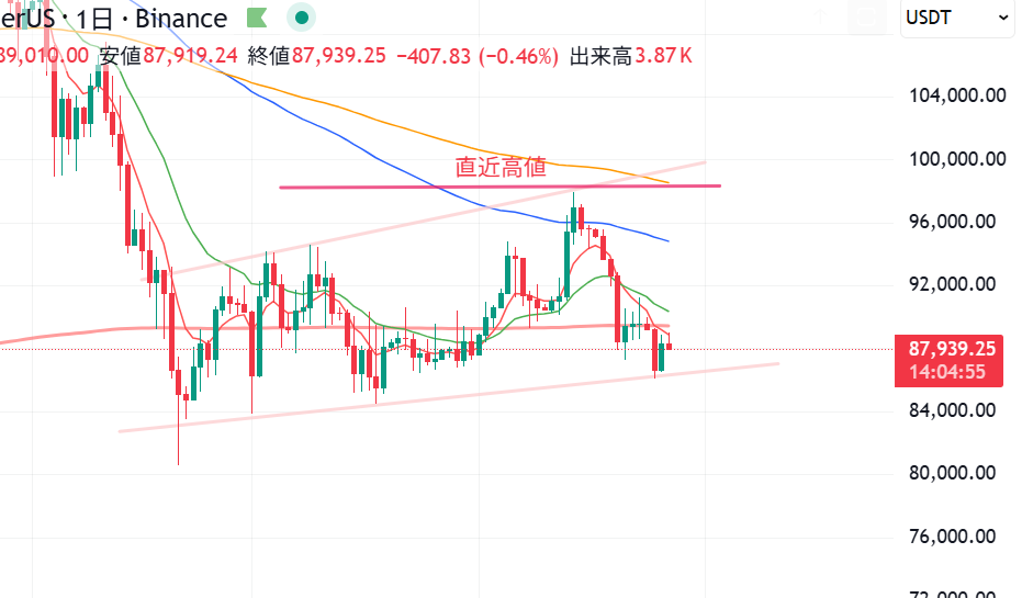 ビットコインのテクニカル分析では、いったん強気シナリオが崩れた後に、どこで下げ止まるかが焦点になります。上昇トレンド中の調整なら、押し目買いが入りやすい帯があり、そこを割ると投げが出やすいという構図です。
