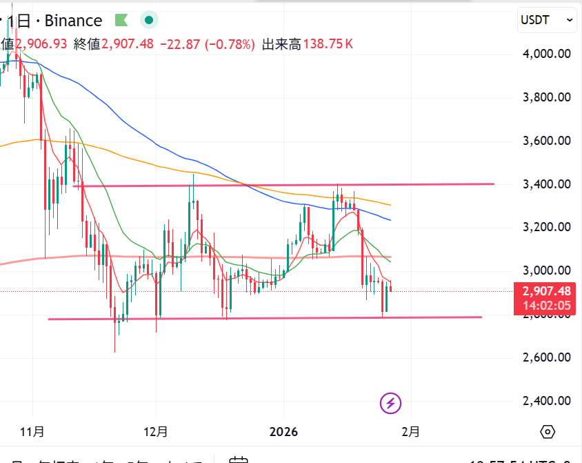 イーサリアムのテクニカル分析 1月27日 2900ドルサポートで踏みとどまれるか